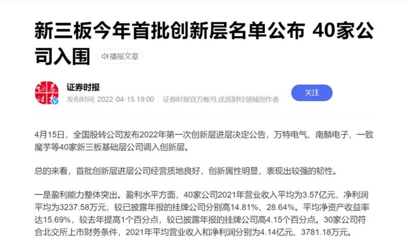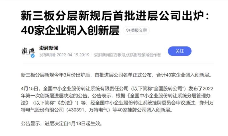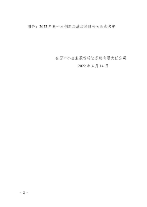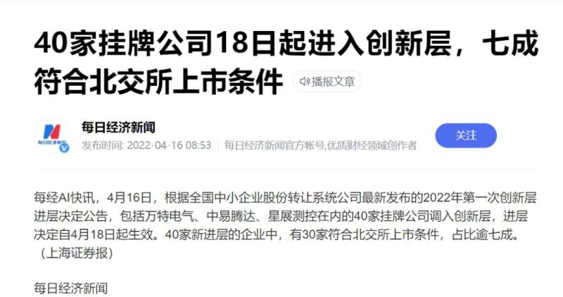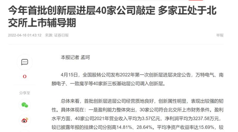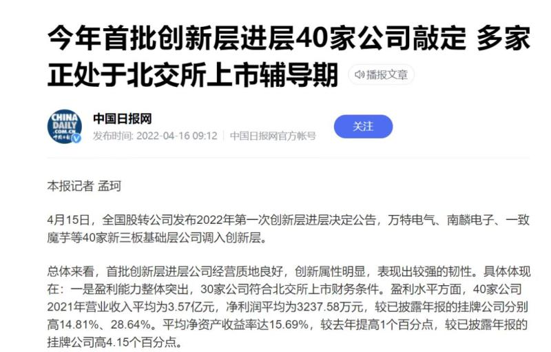 該消息來自于全國股轉公司于 2022 年 4 月 15 日發(fā)布的“2022年第一次創(chuàng)新層進層決定的公告”,這是新三板分層改革后首個進層名單。