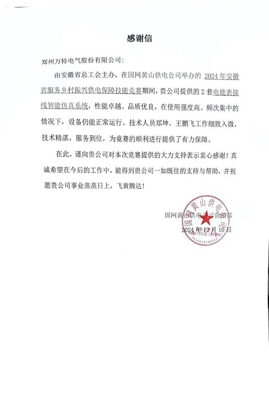 近日,公司收到了一封來自國網(wǎng)黃山供電公司營銷部的感謝信,信中高度贊揚(yáng)了公司在2024年安徽省服務(wù)鄉(xiāng)村振興供電保障技能競賽中的卓越貢獻(xiàn)。