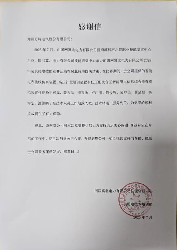 在剛剛結(jié)束的國網(wǎng)河南電力裝表接電及反竊電技能競(jìng)賽和國網(wǎng)冀北電力聯(lián)合河北省職業(yè)技能鑒定中心主辦的裝表接電賽事中,面對(duì)分布式能源安裝、線損分析等復(fù)雜場(chǎng)景,公司設(shè)備全程穩(wěn)定運(yùn)行,為大賽順利進(jìn)行提供了關(guān)鍵技術(shù)保障。客戶分別在感謝信中強(qiáng)調(diào),我司派遣的技術(shù)人員“細(xì)致入微,技術(shù)精湛,服務(wù)到位”、“堅(jiān)守崗位,保障賽事零故障”。